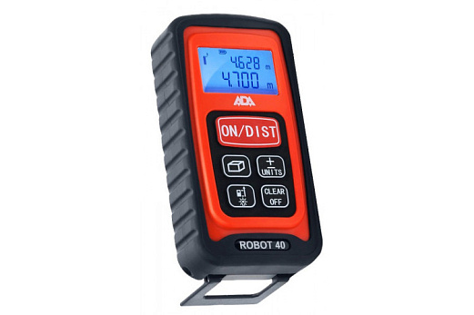 ADA ROBOT 40 – лазерный дальномер (дальность действия 40 м.) для работ внутри помещения и на улице. Выполняет основные измерительные операции – рассчитывает объем и площадь, вычисляет расстояние по теореме Пифагора и проч. Полученные данные можно обрабатывать на месте – дальномер имеет функцию сложения и вычитания значений.
