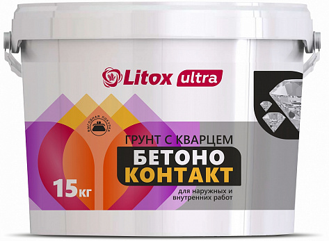 Грунтовка Литокс ULTRA Бетон-Контакт - это специальный адгезионный грунт с кварцевым наполнителем, предназначен для предварительной обработки внутри и снаружи здании плотных, гладких, слабо впитывающих основании (монолитного бетона, бетонных блоков, плотных минеральных оснований и т.п.), перед нанесением гипсовых, цементных, полимерных и воднодисперсионных штукатурок, также подходит для нанесения на старые масляные краски, не поддающиеся полному удалению, и для покрытий из керамической плитки перед укладкой новой плитки.