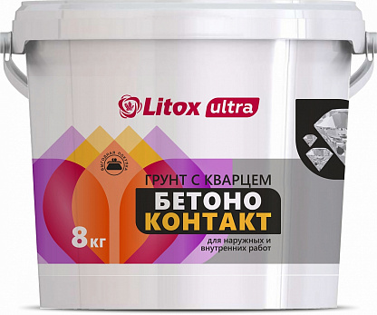 Грунтовка Литокс ULTRA Бетон-Контакт - это специальный адгезионный грунт с кварцевым наполнителем, предназначен для предварительной обработки внутри и снаружи здании плотных, гладких, слабо впитывающих основании (монолитного бетона, бетонных блоков, плотных минеральных оснований и т.п.), перед нанесением гипсовых, цементных, полимерных и воднодисперсионных штукатурок, также подходит для нанесения на старые масляные краски, не поддающиеся полному удалению, и для покрытий из керамической плитки перед укладкой новой плитки.