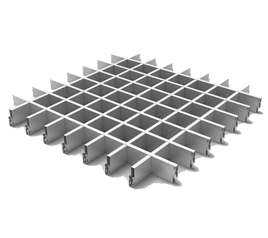 Потолок Грильято представляет собой объемную решётку, образованную U-образными алюминиевыми профилями.