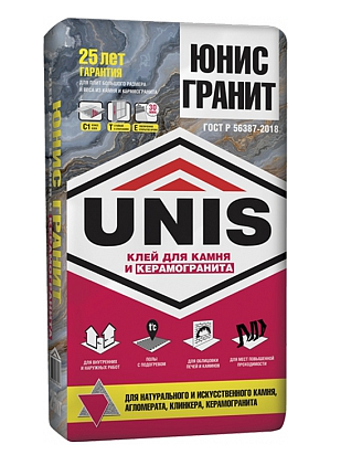 Плиточный клей Юнис Гранит (С1ТЕ) подходит для крепления крупноформатных плит из природного камня и керамогранита.