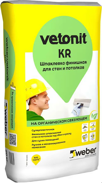 Белая финишная шпатлёвка Vetonit KR на органическом связующем для внутренних работ в сухих помещениях. Идеальна для финишного выравнивания стен и потолков перед покраской или обоями.