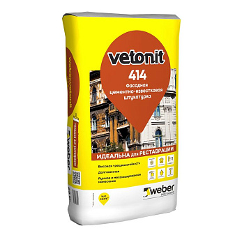 Цементно-известковая штукатурка Vetonit 414 предназначена для оштукатуривания бетонной, кирпичной, цементной и цементно-известковой поверхности слоем толщиной 8–30 мм, для создания базового и выравнивающего слоя в системе фасадного утепления на гибких связях c толстым наружным штукатурным слоем weber.therm MonoRoc, для оштукатуривания по оцинкованной металлической сетке в системе UniTop